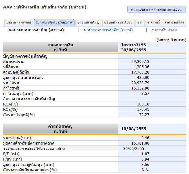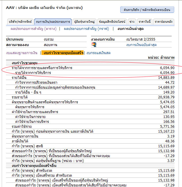 RE : มือใหม่ หัดทำการบ้าน กับหุ้น AAV โพสต์เมื่อ: วันอังคาร 14 สิงหาคม 2555 12:41 น. ![]() เมื่อเข้าไปดูงบการเงินพบว่า บริษัทมีกำไรค่อนข้างมาก กำไรสุทธิ 15,132.98 ล้านบาท |