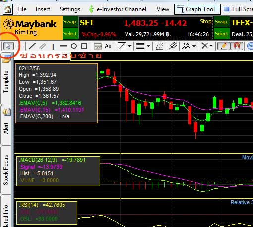 | Menu Graph เป็น Menu ที่แสดงข้อมูลของหลักทรัพย์ในรูปแบบกราฟเทคนิค เพื่อใช้ในการวิเคราะห์ความเป็นไปของตลาด หรือศึกษาแนวโน้มของหลักทรัพย์ตัวที่สนใจ พร้อมทั้งมีเครื่องมือและ Indicator สำหรับช่วยในการทำงานเกี่ยวกับกราฟอีกด้วย |