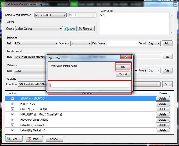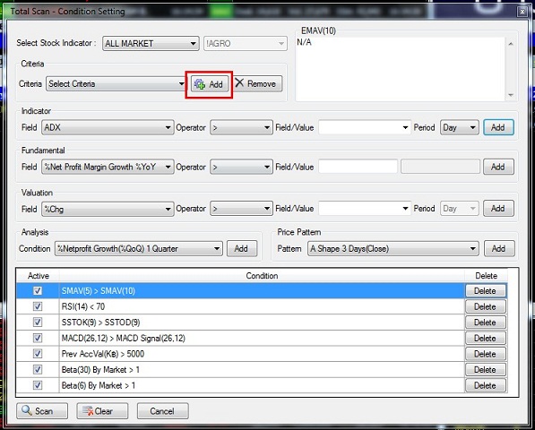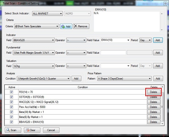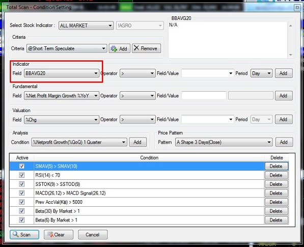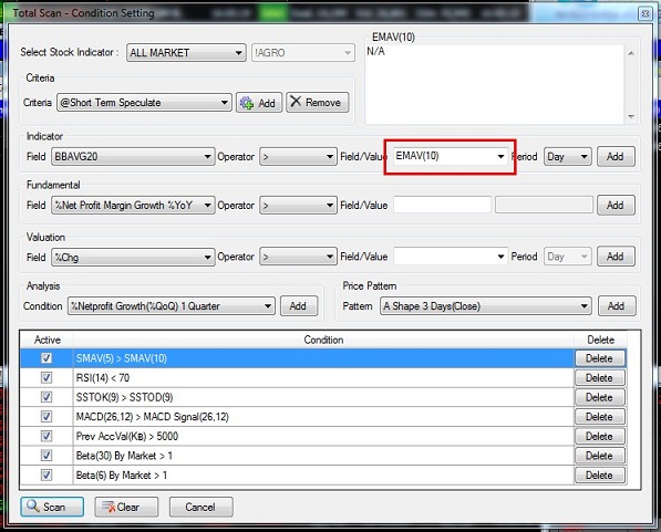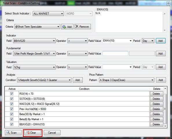 1. คลิกที่ Insert 2. เลือกที่ SET & MAI 3. เลือกที่ Scan 4. เลือกที่ Total Scan ![]() วิธีใช้ 1. คลิกที่ Condition 2. ที่ช่อง Select Stock Indicator เลือกกลุ่มที่ต้องการ เช่นตัวอย่างเลือกเป็น SECTOR![]() 3. กรณีเลือกเป็น SECTOR เลือกชื่อกลุ่มที่ท่านต้องการ ![]() 4. เลือก Default Criteria ที่ท่านต้องการ จากนั้นกดปุ่ม Load 4.1 Short Term Speculate ค้นหาหุ้นเพื่อใช้เก็งกำไรระยะสั้น 4.2 Mid Term Speculate ค้นหาหุ้นเพื่อใช้เก็งกำไรระยะปานกลาง 4.3 Low Risk Stock ค้นหาหุ้นเพื่อใช้เก็งกำไรที่มีความเสี่ยงต่ำ ![]() 5. เลือกปัจจัยที่ท่านต้องการโดยแบ่งออกเป็น 5 หัวข้อคือ 5.1 Technical คือ ค้นหาสัญญาณตามปัจจัยด้านกราฟเทคนิค 5.2 Fundamental คือ ค้นหาสัญญาณตามปัจจัยด้านพื้นฐาน 5.3 Valuation คือ ค้นหาสัญญาณตามปัจจัยด้านมูลค่าการซื้อขายหรือBeta 5.4 Net Profit Growth คือ ค้นหาหุ้นที่กำไรหรือรายได้เติบโตต่อเนื่อง 5.5 Price Pattern คือ ค้นหุ้นที่มีรูปทรงราคาเหมาะสม 6. เลือกเส้นค่าเฉลี่ยที่ท่านต้องการ ![]() 7. เลือกเงื่อนไขที่ต้องการ เช่น มากกว่า,น้อยกว่า หรือ เท่ากับ ![]() 8. เลือกเส้นค่าเฉลี่ยที่ต้องการ จากนั้นกดปุ่ม Add ![]() 9. ค่าที่ Add เข้ามาจะปรากฎอยู่ในกรอบด้านล่าง จากนั้นกดปุ่ม Scan ![]() 10. ระบบจะ Scan หาหุ้นตามปัจจัย และ สัญญาณเทคนิคที่ได้เลือกไว้ ![]() 11. กรณีที่ต้องการลบค่าที่ Add ไว้ออกให้คลิกที่ปุ่ม Delete ![]() 12. หากต้องการ Clear ค่าที่ตั้งไว้ทั้งหมดให้กดปุ่ม Clear ![]() 13. นักลงทุนสามารถ Save เงื่อนไขไว้ได้โดยคลิก Add ที่ส่วนของ Criteria ![]() 14. พิมพ์ชื่อที่ต้องการ Save แล้วกด OK ![]() ที่มา https://www.efinancethai.com/manual/manual_help/SmartPortal/HTML/Scan_TotalScan_2012.htm |