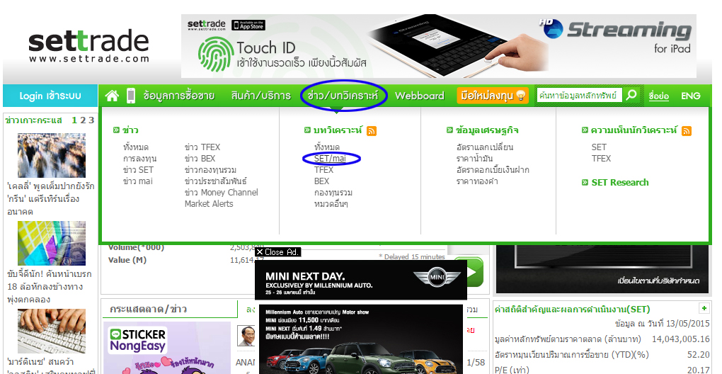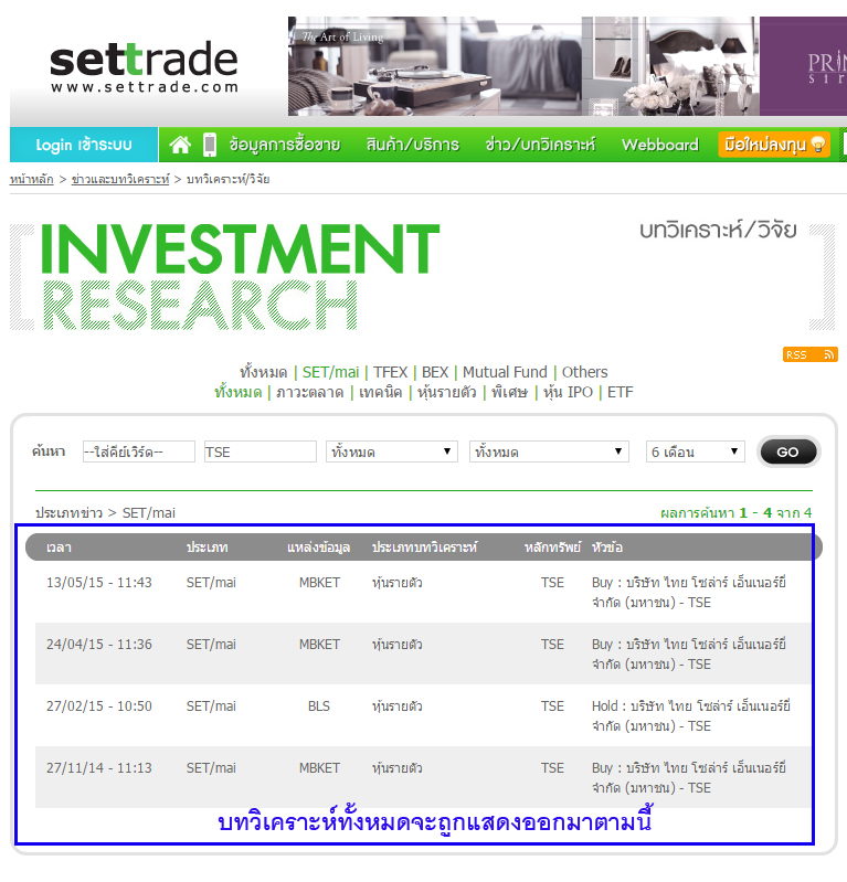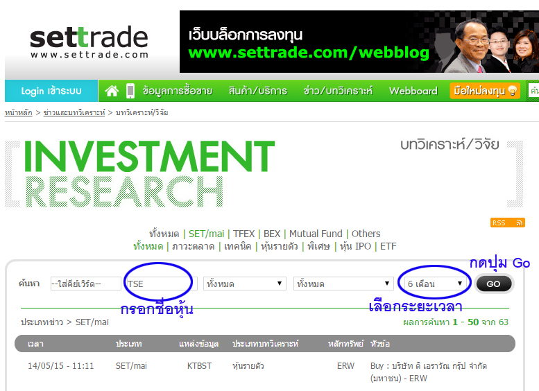 2. คลิ๊กที่ ข่าว / บทวิเคราะห์ 3. คลิ๊กที่ SET/mai ![]() 4. กรอกชื่อหุ้น 5. เลือกระยะเวลาย้อนหลัง 6 เดือน (สูงสุดแล้ว) 6. กดปุ่ม GO เพื่อค้นหา ![]() ------------------------------------------------------------------------------ รายการบทวิเคราะห์ทั้งหมดจะแสดงออกมาตามในรูปภาพ ![]() |