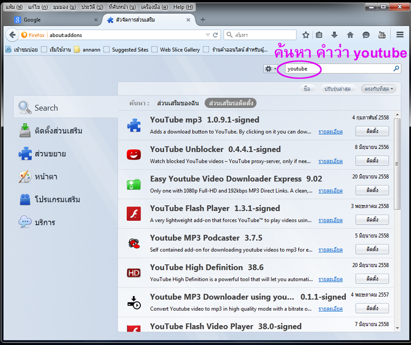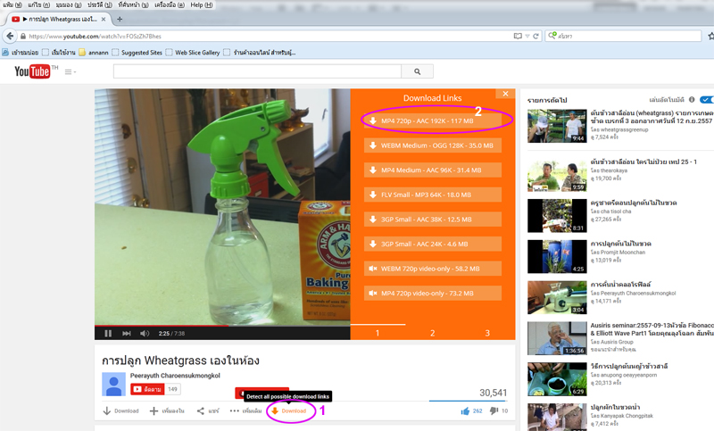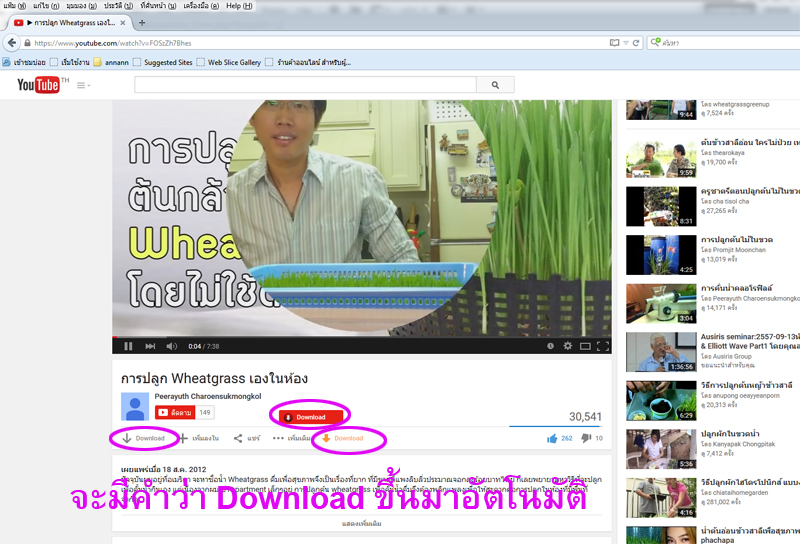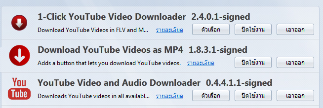 ใครที่ยังไม่ได้ติดตั้ง Mozilla Firefox คลิ๊กติดตั้งได้ที่นี่ https://www.mozilla.org/th/firefox/new/ ![]() 2. คลิ๊กที่มุมขวาขอจอ (หมายเลข 1) 3. คลิ๊กที่ ส่วนเสริม (หมายเลข 2) ![]() 4. กรอกช่องค้นหา ใส่คำว่า youtube ![]() 5. กดติดตั้ง ชื่อโปรแกรมตามนี้ (ของเราติดตั้งไปแล้ว เลยไม่มีคำว่าติดตั้งแสดงให้เห็น) ![]() 6. เมื่อคุณเปิด Mozilla Firefox เข้าเวบไซต์ Youtube จะมีคำว่า Download แสดงขึ้นมาอัตโนมัติ ![]() 7. คลิ๊ก ที่คำว่า download (เช่นคลิ๊ก ที่ หมายเลข 1) 8. จะมีไฟล์ให้เลือก ว่าต้องการโหลดแบบไหน (หมายเลข 2) เลือกที่ความละเอียดสูงสุด MP4 720p ![]() 9. รอสักครู่ (สังเกตที่รูปลูกศรชี้ลง หัวมุมขวาของจอด้านบน จะมีระยะเวลาที่ใช้ในการดาวน์โหลดบอก) 10. ไฟล์ที่โหลดเสร็จแล้ว จะอยู่ที่หน้า desktop |