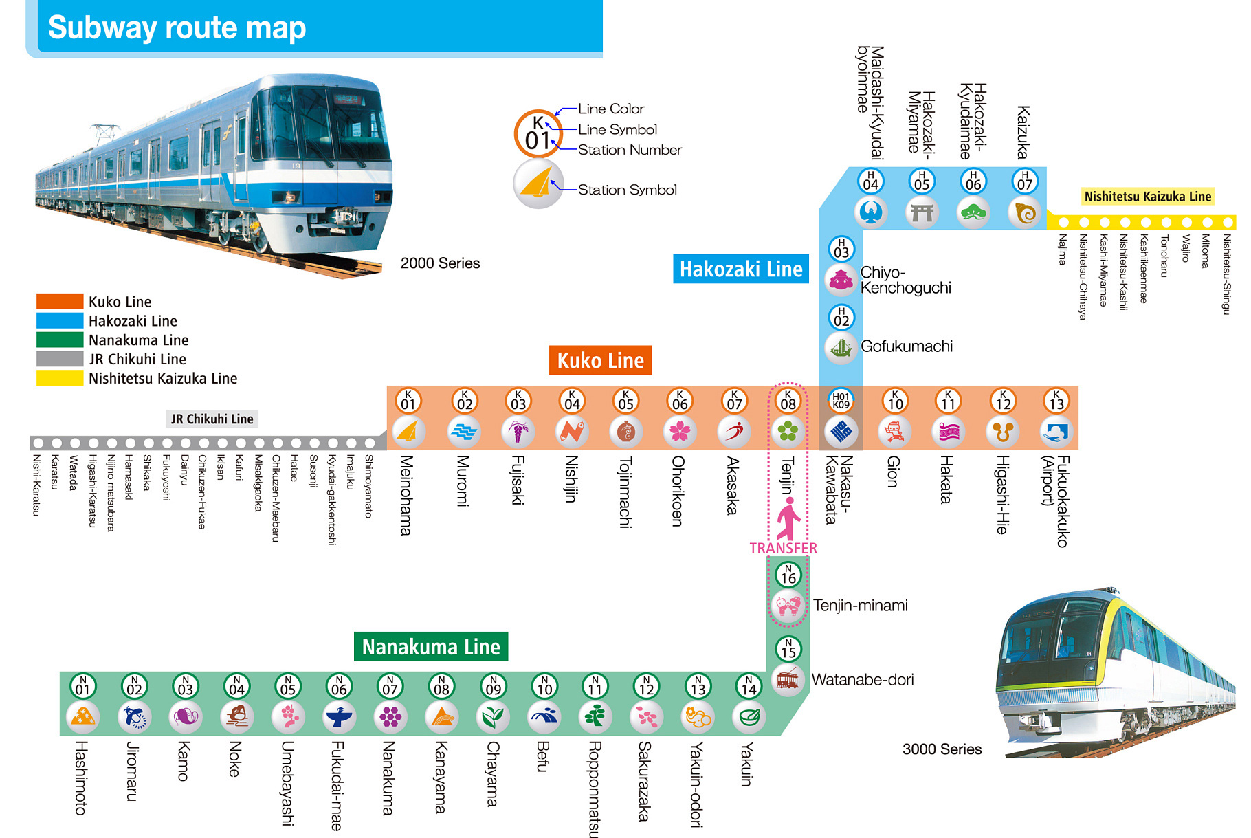 แผนที่รถไฟใต้ดินฟุกุโอกะ มี 3 สาย คลิ๊กที่รูปดูรูปใหญ่