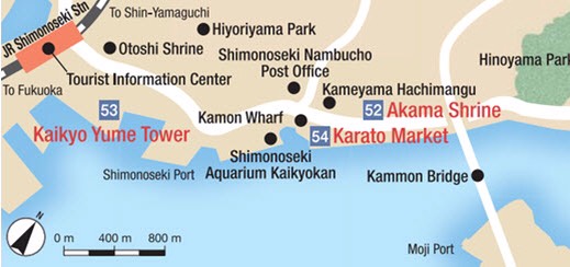 13.45 น. MOJIKO Retro town อยู่ใกล้ตลาด Karato จาก สถานี shimonoseki station นั่งไปสถานี Mojiko (2 สถานี) ค่ารถไฟประมาณ 220 เยน