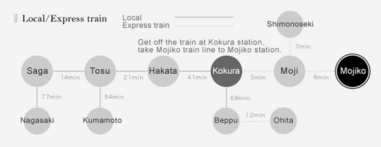จาก Kokura ไป Mojiko ไม่ต้องจองที่นั่ง ใช้รถไฟสาย JR Kagoshima Line 16 นาที