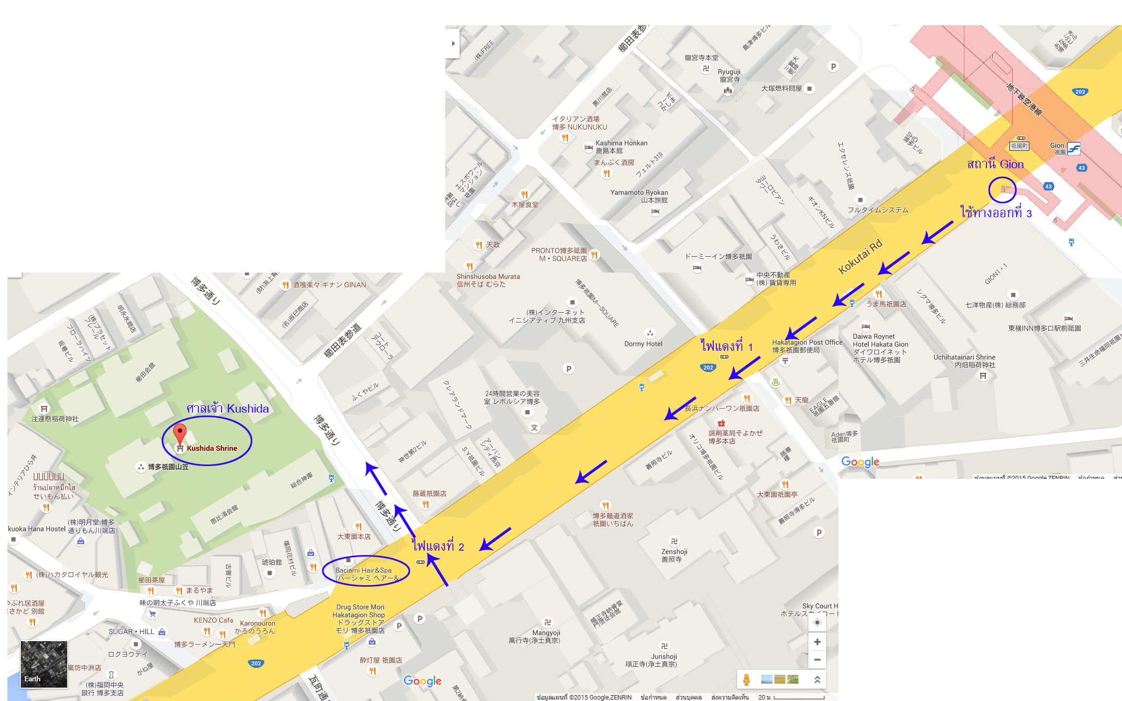 การเดินทาง: จากสถานี Hakata ทางออก 7 (ออกจากตึก) เจอไฟแดงแรก