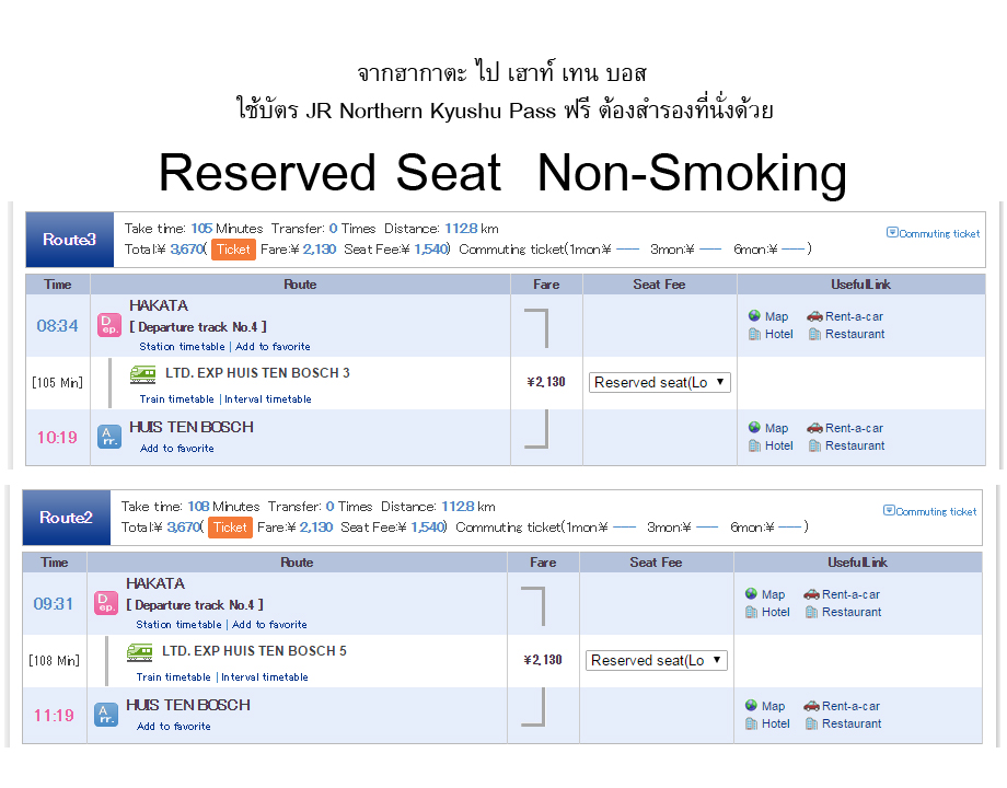 - นั่งรถไฟใต้ดินไปลง สถานี JR Hakata แล้วนั่งรถไฟสาย LTD. EXP HUIS TEN BOSCH (จองที่นั่งด้วย)